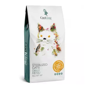 Сухий корм CooKing беззернова формула з свіжим м'ясом для стерилізованих котів. Повнораціонний збалансований беззерновий сухий корм розроблений ветеринарними лікарями та дієтологами, щоб забезпечити здоров’я Вашого стерилізованого котика. Раціон виготовляється із ретельно відібраних свіжих та корисних компонентів. Склад: Свіжий лосось (мінімум 23%), картопля, свіже куряче м'ясо (мінімум 20%), бобові, пивні дріжджі, жир домашньої птиці, гідролізат курячої печінки, дегідратований лосось, овочі (цикорій, морква, зелена квасоля, кольрабі), мінеральні речовини, лігноцелюлоза, яблучна клітковина, хондропротекторний комплекс (глюкозамін гідрохлорид, хондроїтин сульфат, МСМ, екстракт зелених мідій (Perna canaliculus)), таурин, манно-олігосахариди, фрукто-олігосахариди, рислини (календула, шавлія, пажитник, кріп, чебрець, шипшина), екстракт Юкки Шигідгера, пребіотики, екстракти (червоних плодів, цитрусових, насіння розторопші, насіння зеленого чаю, м'яти, розмарину), природні антиоксиданти, живі пробіотики (E. faecium). Аналітичний склад: Сирий білок: 32 % Сирий жир: 11 % Сира клітковина: 3 % Зола: 8 % Кальцій: 1,2 % Фосфор: 0,8 % Омега 3: 0,29 % Омега 6: 1,36 % Хондроїтин: 715 мг/кг Глюкозамін: 1,130 мг/кг Амінокислоти: Таурин: 1600 мг/кг