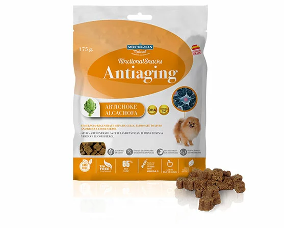 FUNCTIONAL SNACK снеки для собак ANTIAGING, 175 г. Функціональні снеки "MEDITERRANEAN NATURAL" - ласощі, що виготовлені на 100% з натуральних компонентів. Не містять глютену, штучних барвників, ГМО або транс-жирних кислот і є природним джерелом Омега 9. Властивості: Ласощі сприяють регенерації клітин печінки, виведенню токсинів та зниженню рівеню холестерину. Склад: 65% м'яса (25% хамону, 23% курячого м'яса, 17% яловичого м'яса), рис, рослинний гліцерин, лосось, тунець, екстракту артишоку 2%, пивні дріжджі. Натуральні добавки: консерванти: лимонна кислота, мурашина кислота. Харчові добавки: олія материнки, розмарину, вітамін А 7665, вітамін D3 1800, вітамін Е (альфа-токоферол) 23,3.Аналітичні складові (на 100 г): сирий протеїн 26,5%, сирий жир 6,9%, сира зола 15,4%, клітковина 0,86%, волога 12,4%, Кальцій 3,3г, Фосфор 1,6г, Омега3: 0,14г (DHA 58 мг); Омега6: 0,70 г; олеїнова кислота "Омега 9": 1,48г. Енергетична цінність (ккал/100 г): 320 Ккал / 100г. Рекомендована добова норма: Маленькі собаки: 5-10 шт Середні собаки: 11-20 шт Великі собаки: 21-30 шт