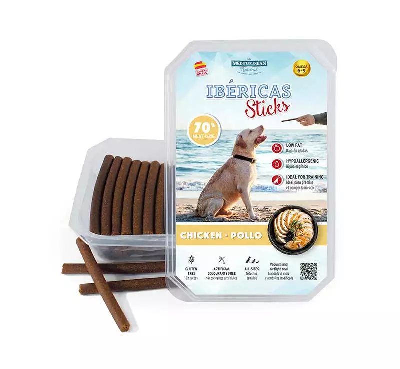 Ibericas Sticks м’ясні палички КУРКА 800g Ibericas Sticks від MEDITERRANEAN NATURAL - це 100% натуральні ласощі для собак, що виготовлені з м’яса та риби найвищої якості. Містять олію орегано та розмарин, природні антиоксиданти, які покращують травлення. Гіпоалергенні, не містять глютену, штучних барвників, ГМО, трансжирних кислот. Склад: М'ясо 70% (мінімум 30% курячого м'яса), рис хв. 7,5%, гліцерин, добавки: пропіонова кислота, сорбат калію. Антиоксиданти: лимонна кислота, олія орегано. Аналітичні складові: Білок: 25,7%, жир: 6,1%, сира зола: 10,2%, клітковина: 0,9%, волога: 16,6%, 320 Ккал / 100г. омега 6: 0,6 г / 100 г, омега 9: 1,5 г / 100 г