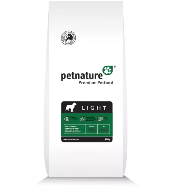 Сухий корм PetNature для собак всіх порід - LIGHT DOG Склад: гідролізований курячий білок, кукурудза, побічні продукти тваринного походження, кукурудзяний білок, жир домашньої птиці, рибне борошно, натуральний ароматизатор–печінка птиці, пивні дріжджі, риб’ячий жир, лігноцелюлоза, глюкозамін гідрохлорид, хондроїтин сульфат, екстракт Юкки Шидігера, фолієва кислота, L-лізин, маннано-олігосахариди, фрукто-олігосахариди, природні антиоксиданти, вітаміни та мінерали, цинку хелат. Аналітичний склад: Сирий білок 25%, Сирий жир 10%, Сира клітковина 6%, Сира зола 9%, Вологість 10%, Натрій 0,3%, Кальцій 2,4%, Фосфор 1,6%. Харчові добавки (на 1 кг): Вітаміни та мінерали: Вітамін А 16.000 МО, Вітамін Д3 1.500 МО, Вітамін Е (альфа-токоферол) 100 мг, Заліза сульфат моногідрат 250 мг, Кальцію йодад ангідрит 0,5 мг, Мідного купоросу пентагідрат 15 мг, Марганцю оксид 3 мг, Цинку сульфат моногідрат 150 мг, Натрію селеніт 0,4 мг. Антиоксиданти: E320 150 мг / кг. Рекомендована добова норма: Згодовується тваринам з урахуванням віку, маси тіла та рівня активності.