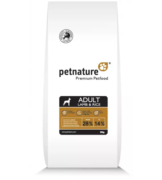 Сухий корм PetNature для собак всіх порід ЯГНЯ & РИС - LAMB & RICE all breed DOG Склад: зернові (рис, мін. 10%), м'ясо та тваринні побічні продукти (баранина, мін. 10%), похідні рослинного походження, бобові, екстракти рослинних білків, олії та жири, риба та рибні побічні продукти, дріжджі, вітамінний комплекс, глюкозамін гідрохлорид, хондроїтин сульфат, екстракт Юкки Шидігера, мінеральні речовини. Аналітичний склад: Сирий білок 28%, Сирий жир 14%, Сира клітковина 2,5%, Зола сира 8,5%, Вологість 10%, Кальцій 1,7%, Фосфор 1,3%. Харчові добавки (на 1 кг): Вітаміни та мінерали: Вітамін 18.000 МО, Вітамін Д3 1.200 МО, Вітамін Е (альфа-токоферол) 100 мг, Заліза сульфат моногідрат 105 мг, Кальцію йодад ангідрит 0,15 мг, Мідного купоросу пентагідрат 11 мг, Марганцю оксид 5,5 мг, Цинку сульфат моногідрат 95 мг, Натрію селеніт 0,2 мг. Антиоксиданти: E320 150 мг / кг. Рекомендована добова норма: Згодовується тваринам з урахуванням віку, маси тіла та рівня активності.