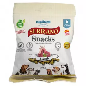 SERRANO снеки для собак 100g, ягненок SERRANO от MEDITERRANEAN NATURAL - это 100% натуральные лакомства для собак, изготовленные из мяса и рыбы высокого качества. Содержат масло орегано и розмарин, природные антиоксиданты, которые улучшают пищеварение. Гипоаллергенны, не содержат глютена, искусственных красителей, ГМО, трансжирных кислот. Состав Мясо 70% (минимум 16% мяса ягненка), рис, растительный глицерин, консерванты: пропионовая кислота, формиат кальция, лимонная кислота, масло орегано. Аналитические составляющие: Белок: 25,8%, сырой жир: 6,4%, сырая зола: 11,7%, клетчатка: 1,1%, влага: 13,7%, Омега 6: 0,42г / 100г, Омега 9: 1,29г / 100г.